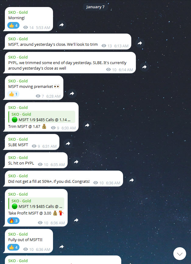 In this Gold example, we call out a MSFT stock option position. We give the Stock, Strike Price, Call/Puts, and expiration date. Additionally, Once the market starts to move, we start calling out the trim prices in real-time. This allows you as the trader to follow our position and manage it similartly. As we profit, you profit.